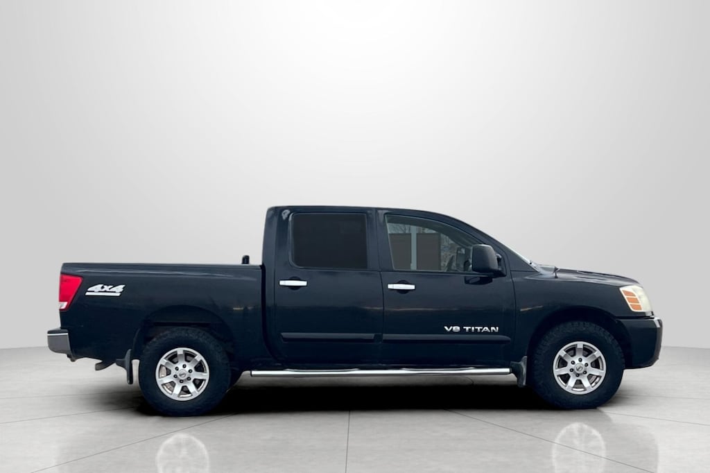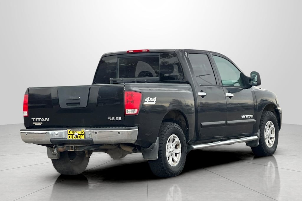 Galaxy Black Metallic 2006 Nissan Titan SE 4WD 5-Speed Automatic with Overdrive 5.6L V8 SMPI DOHC 4WD, 18" x 8.0J 5-Spoke Alloy Wheels, 2.937 Axle Ratio, 4-Wheel Disc Brakes, 40/20/40 Front Split Bench Seat, 8 Speakers, ABS brakes, Air Conditioning, Alloy wheels, AM/FM radio, AM/FM/In-Dash 6-CD Changer, Anti-whiplash front head restraints, Bodyside moldings, Bumpers: chrome, CD player, Cloth Seat Trim, Driver door bin, Driver vanity mirror, Driver's Seat Mounted Armrest, Dual front impact airbags, Front anti-roll bar, Front Bucket Seats, Front Captain's Chairs, Front reading lights, Front wheel independent suspension, Heated door mirrors, Illuminated entry, Leather Shift Knob, Leather steering wheel, Low tire pressure warning, Occupant sensing airbag, Overhead console, Panic alarm, Passenger door bin, Passenger seat mounted armrest, Passenger vanity mirror, Power door mirrors, Power steering, Power windows, Radio data system, Rear seat center armrest, Rear step bumper, Rear window defroster, Remote keyless entry, Security system, Speed control, Speed-sensing steering, Speed-Sensitive Wipers, Split folding rear seat, Tachometer, Tilt steering wheel, Tow Receiver Hitch, Traction control, Variably intermittent wipers, Voltmeter, 4WD.
